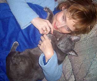 My Boyo was my love. I first saw him shining in the sun at the shelter, all silvery. He was my Russian Blue Boy, with white spots. He was Mr. Cat Ambassador to the world, and he left a huge hole in my heart. I decided to switch careers into Vet Tech because I so loved taking care of him. He was only 11 years, an indoor cat. He developed cardiomyopathy (dilative), with heart failure. He seemed to respond to treatment, albeit with frequent crises, but in only 2 months, he was gone. The lymphoma only showed up on radiograph 1 week before he had to be euthanized; his lungs were covered in it, so he couldn't breathe. We found out when he was startled by a dog whose owner let it run up to all the other pets in the waiting room at the clinic; Boyo had been doing great, then crashed within minutes. Later that day, the x-ray showed why. I don't know if the cardiomyopathy was related to the lymphoma. He didn't respond to prednisone, and it was too late for chemotherapy. We had spent hundreds of dollars by that point, and we'd do it again. That last night, he curled up by my head and purred; he used to cuddle by my heart, with his cheek to mine. He loved being held and cuddled, but couldn't stand it for long at the end. I had him cremated with one of his "babies" - a fluffy toy on a stick, which he bathed, watered, fed, chased, and brought to bed with us to it could cuddle with me. Everything he did, his baby did. We went through a lot of them.